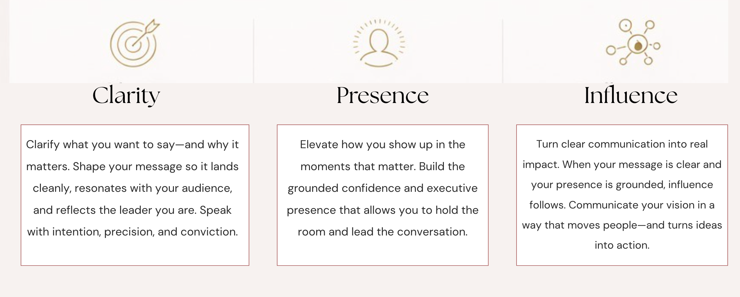 From here, you’ll have the tools, strategies, and confidence to communicate with clarity and impact. Whether it’s on stage, on camera, in meetings, or leading your team, you’ll be ready to show up fully and own the room.