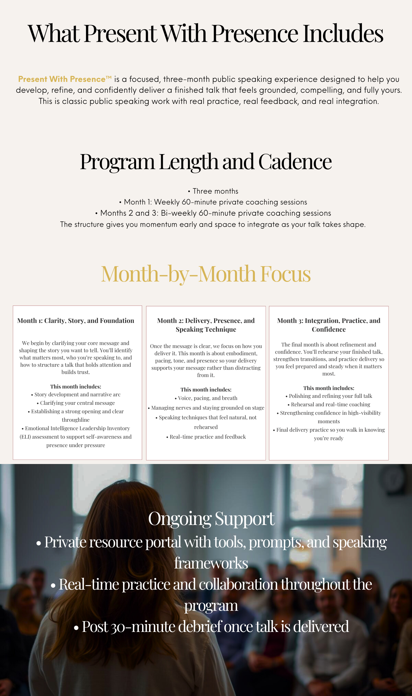 Present With Presence is a public speaking coaching experience designed to help you develop, refine, and practice a finished talk so you feel confident delivering it to any audience. You’ll shape your message, strengthen your delivery, and rehearse with intention so you can speak with clarity, credibility, and grounded presence.